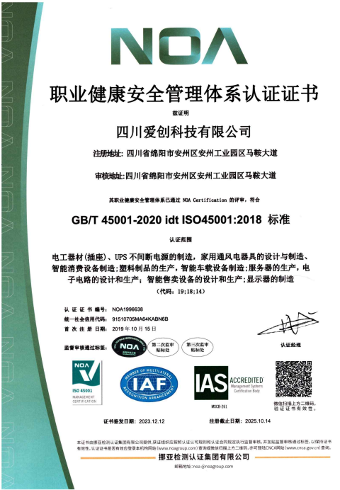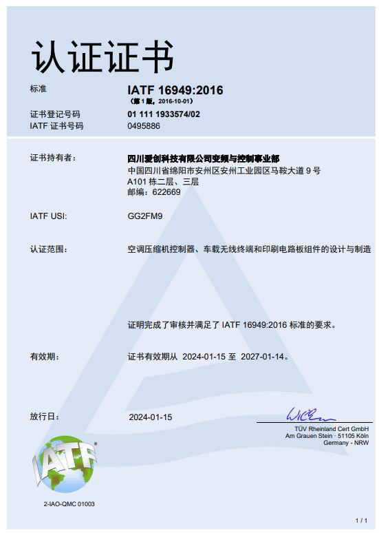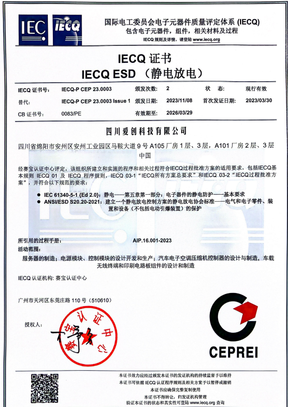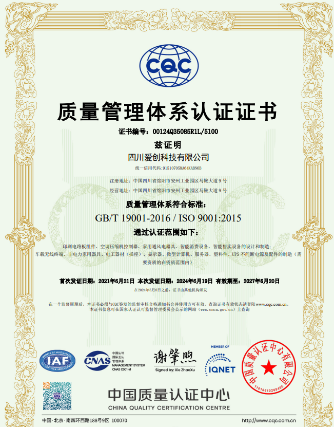 愛創(chuàng)公司自成立以來,堅持貫徹“以人為本、創(chuàng)新創(chuàng)效、品質(zhì)卓越、顧客滿意”質(zhì)量方針,建立了完善的質(zhì)量管理體系,持有ISO 9001、IATF 16949、ISO 14001、ISO 45001、IECQ ESD等管理體系證書并有效運行。