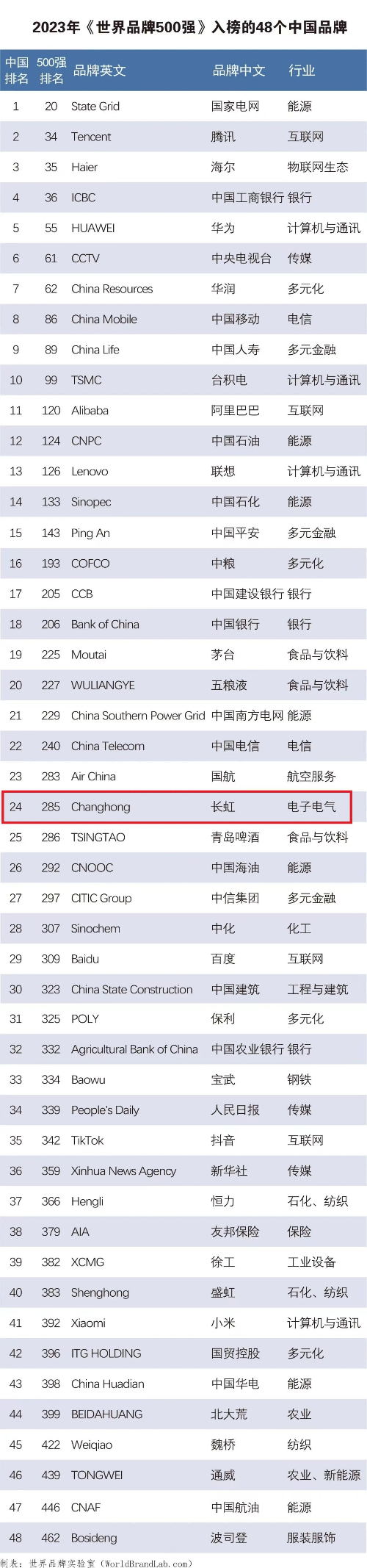 長(zhǎng)虹排名世界品牌榜第285位
